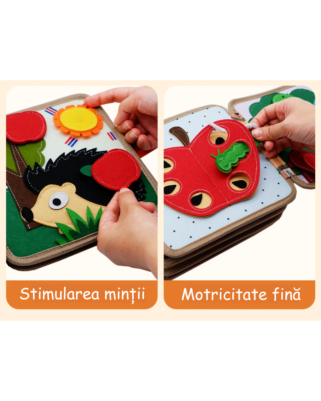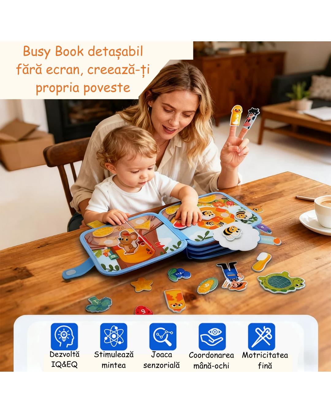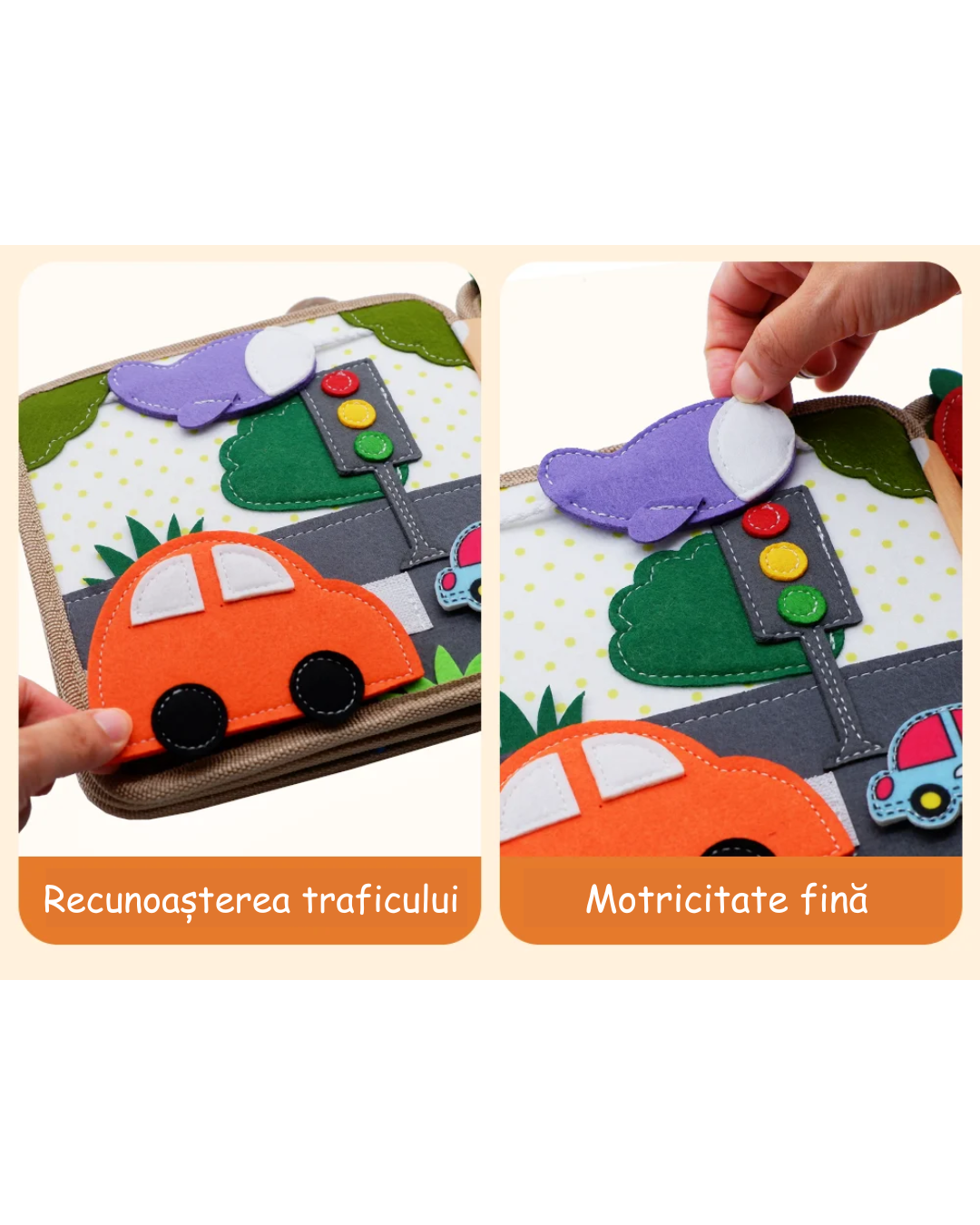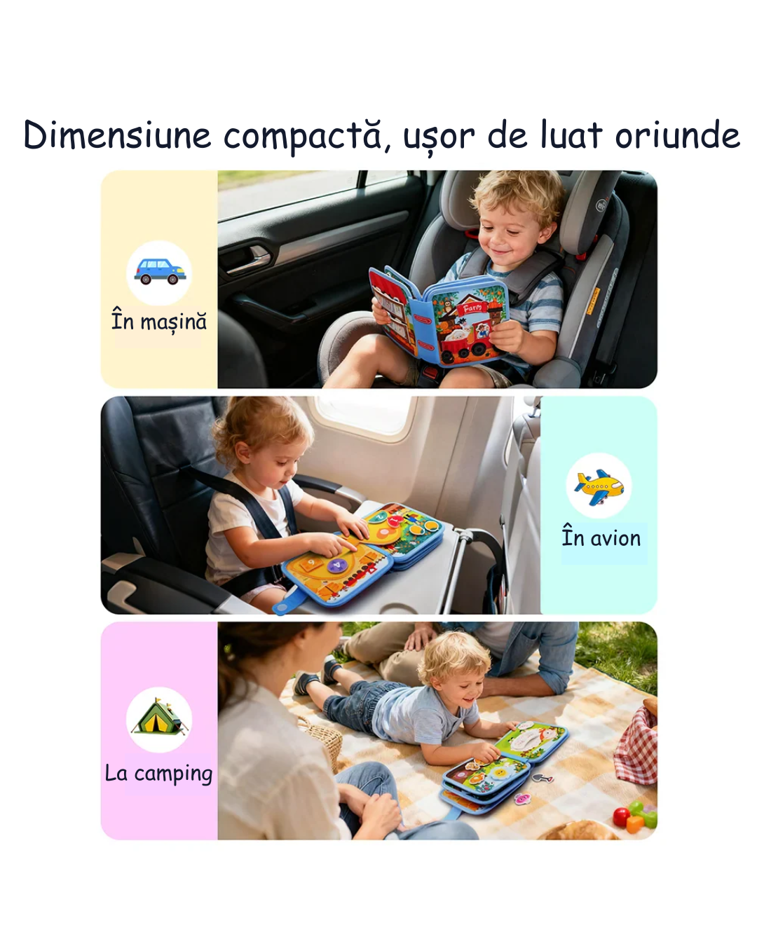 Realizată din materiale textile moi și rezistente, fără substanțe chimice periculoase, cartea Busy Book este concepută pentru utilizare zilnică, cu toate piesele bine fixate prin cusături. Dimensiunea compactă o face ușor de transportat în mașină, avion sau în timpul ieșirilor, oferind copilului activități liniștite, iar părinților un plus de confort. Poate fi oferită și ca joc educativ pentru diverse ocazii.