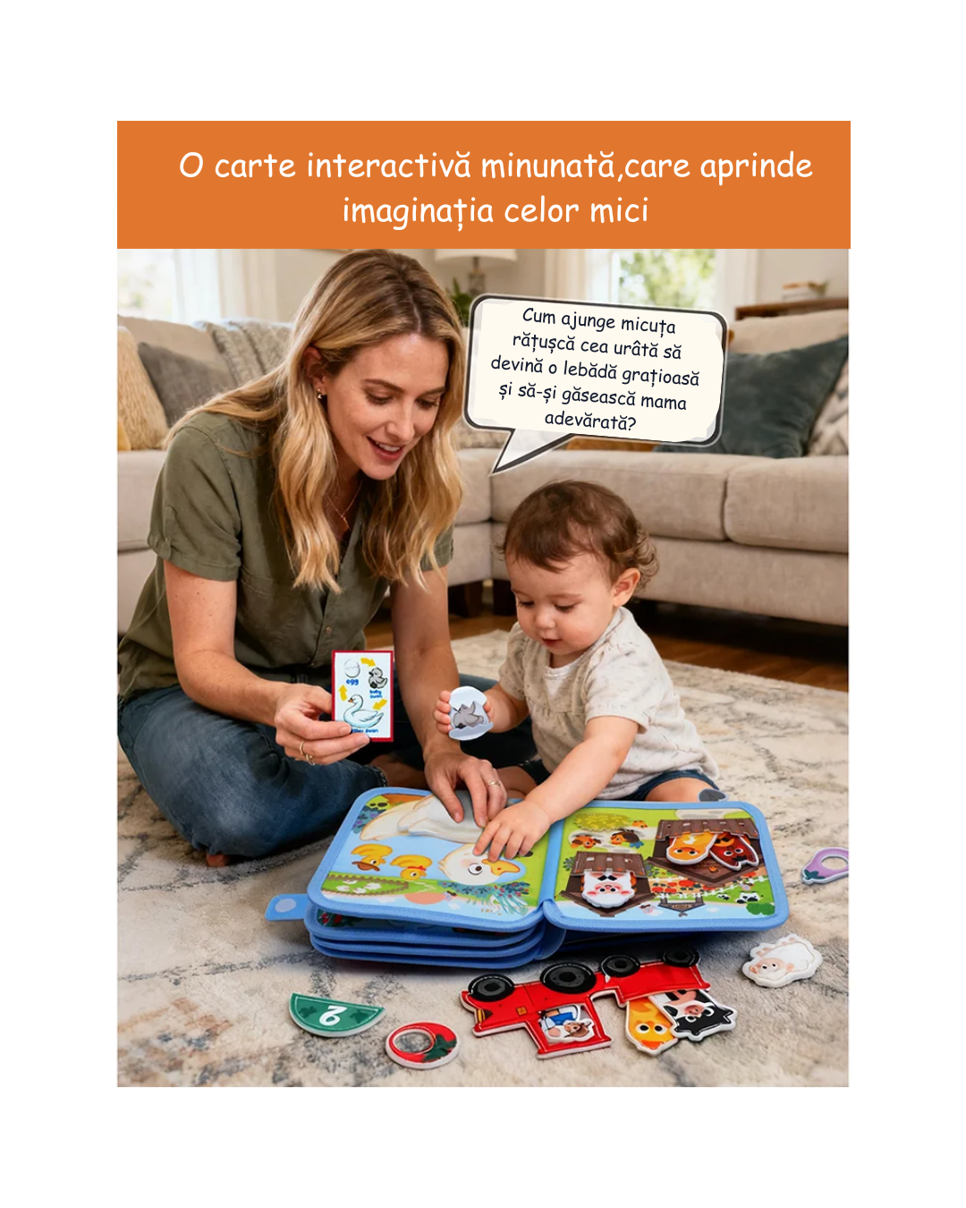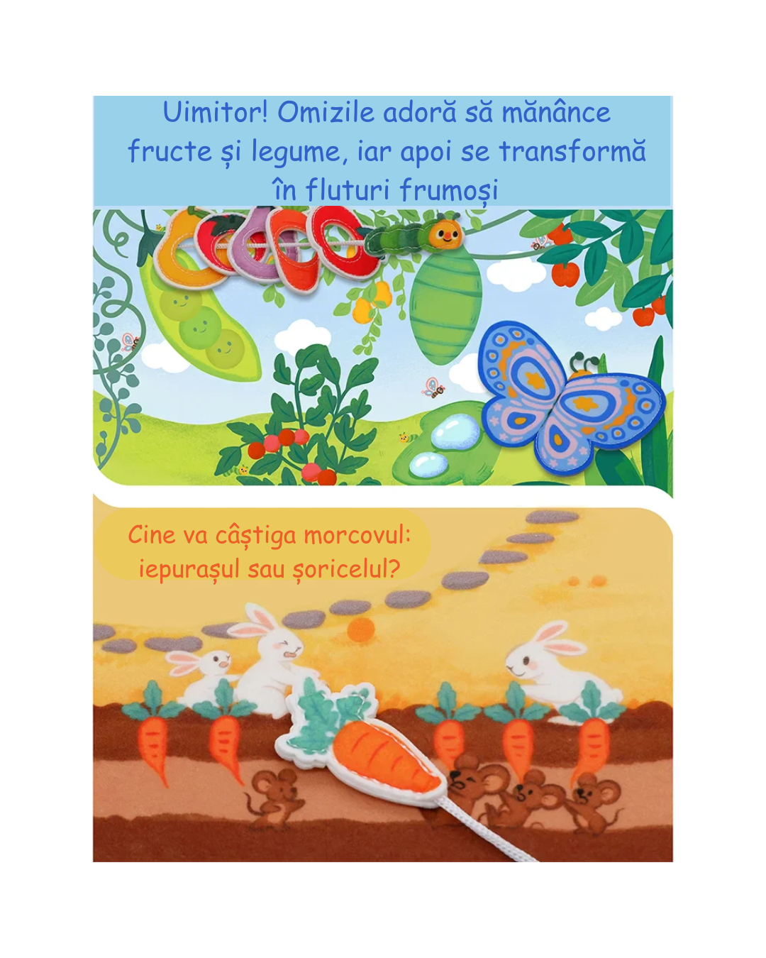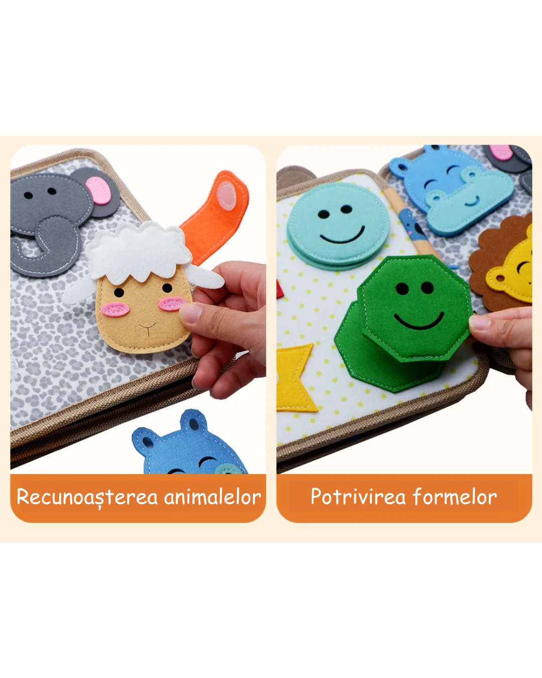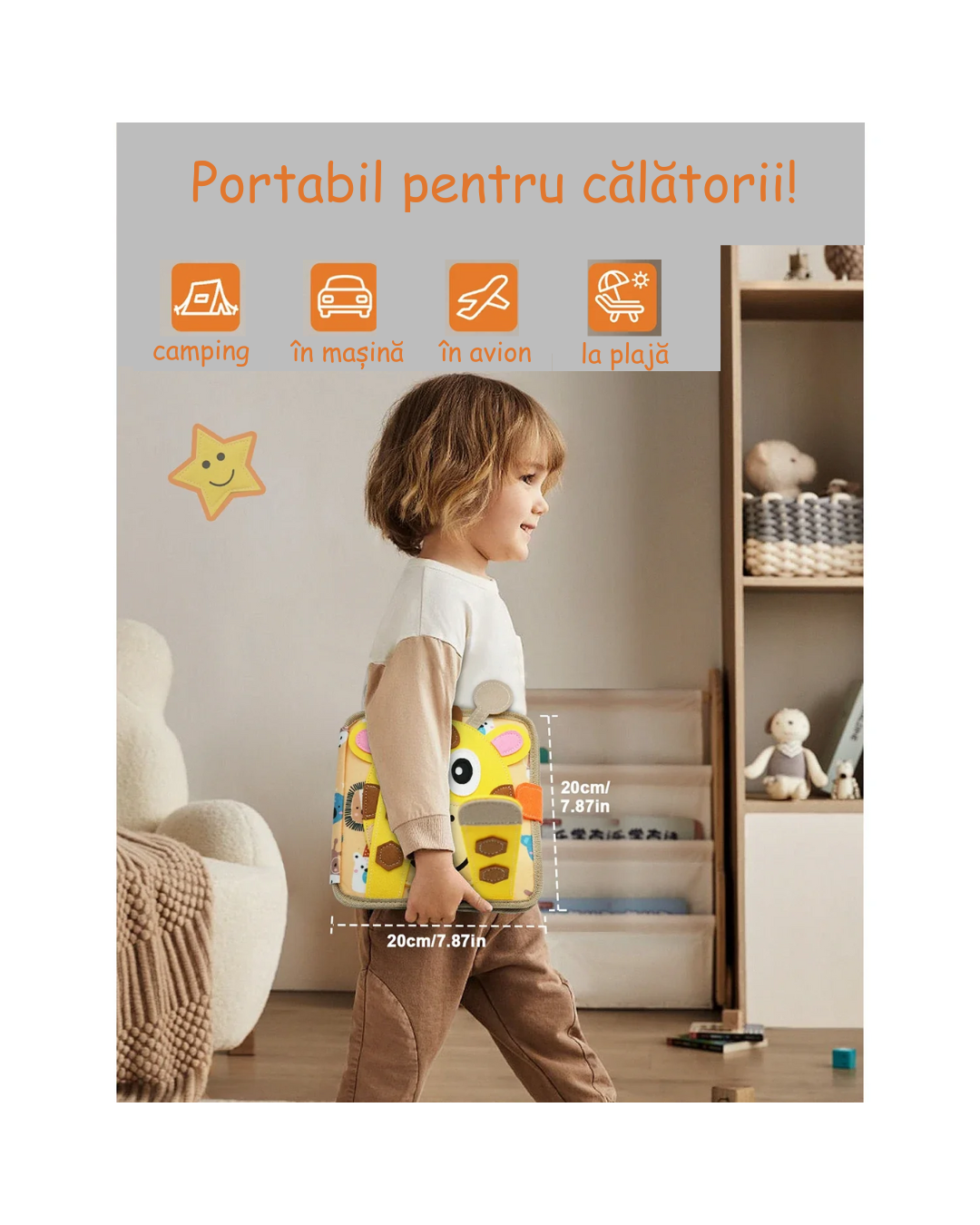 Proiectată conform principiilor Montessori și susținută de etapele reale de dezvoltare ale copilului, cartea include 10 pagini pline de activități: girafe tip „hide & seek”, potriviri de păsări colorate, mașinuțe rulante și forme interactive. Aceste exerciții ajută la dezvoltarea motricității fine, coordonării mână–ochi, recunoașterii culorilor și formelor, încurajând totodată învățarea independentă și încrederea în sine.
