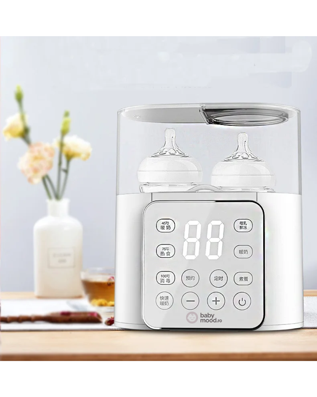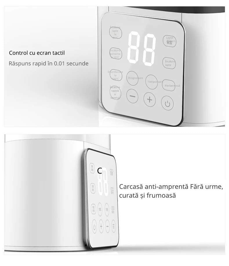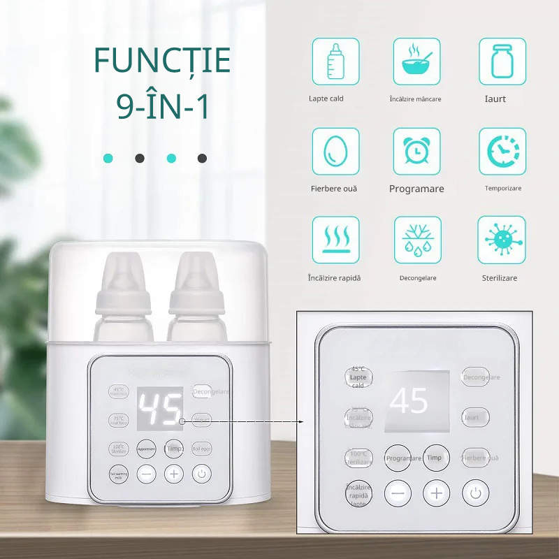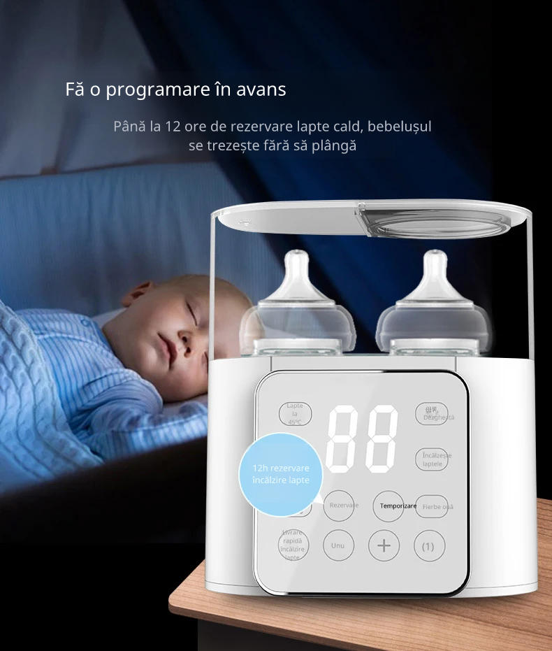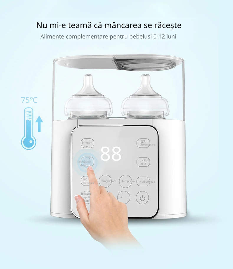 Cu un design modern și funcții inteligente, aparatul încălzește, sterilizează și menține temperatura potrivită pentru hrănire. Poți încălzi două biberoane simultan, iar temperatura se reglează cu precizie pentru un rezultat perfect de fiecare dată.
